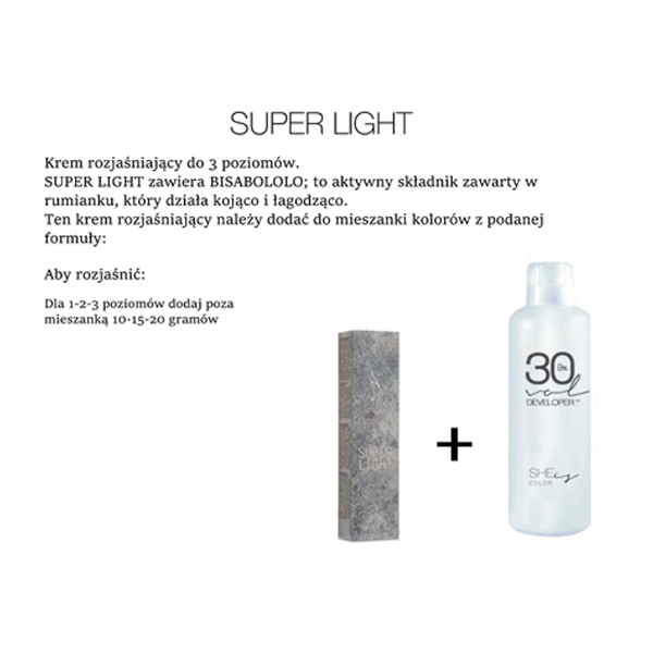 Szukasz sposobu na bezpieczne podniesienie poziomu koloru bez ryzyka podrażnień? SHEis Color Super Light to innowacyjny krem rozjaśniający, który łączy siłę działania z delikatnością natury. To idealny dodatek do Twoich usług koloryzacji, pozwalający na uzyskanie jaśniejszego odcienia nawet o 3 poziomy, przy zachowaniu najwyższej kondycji włosa.